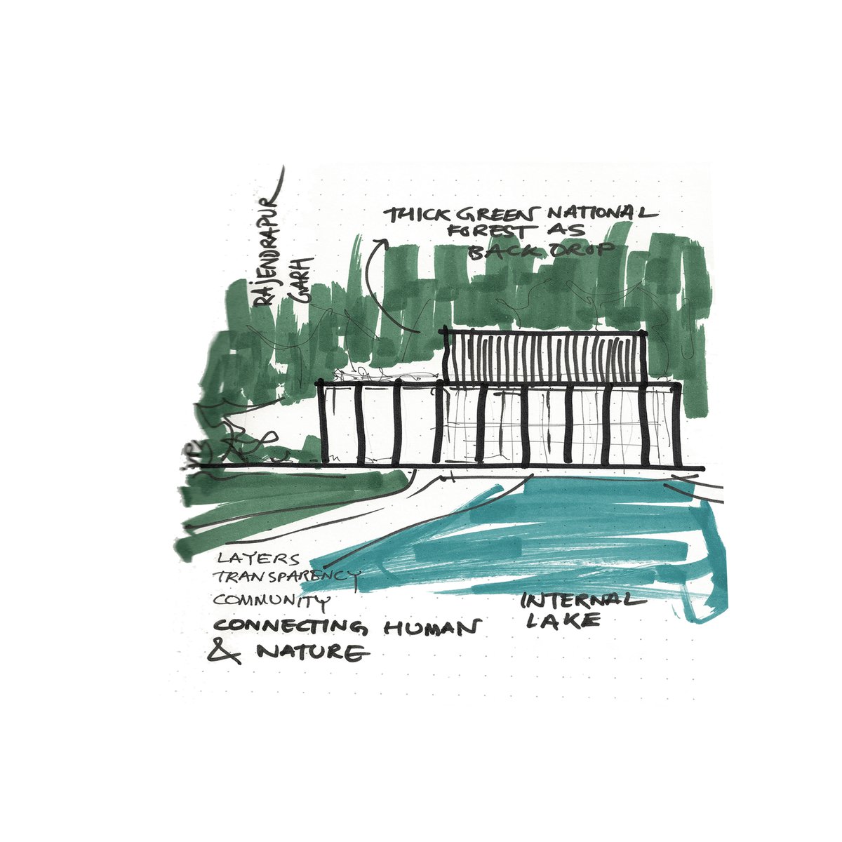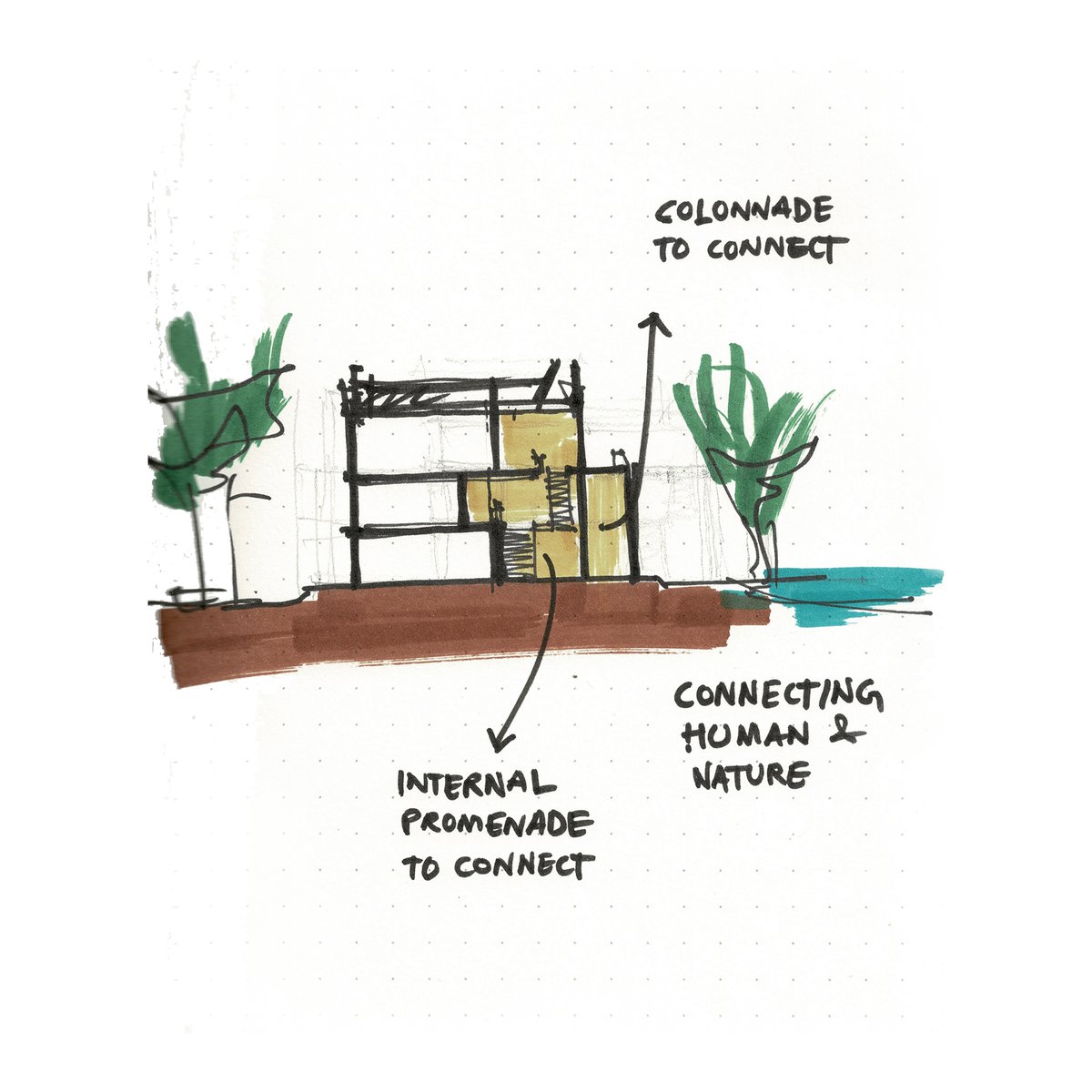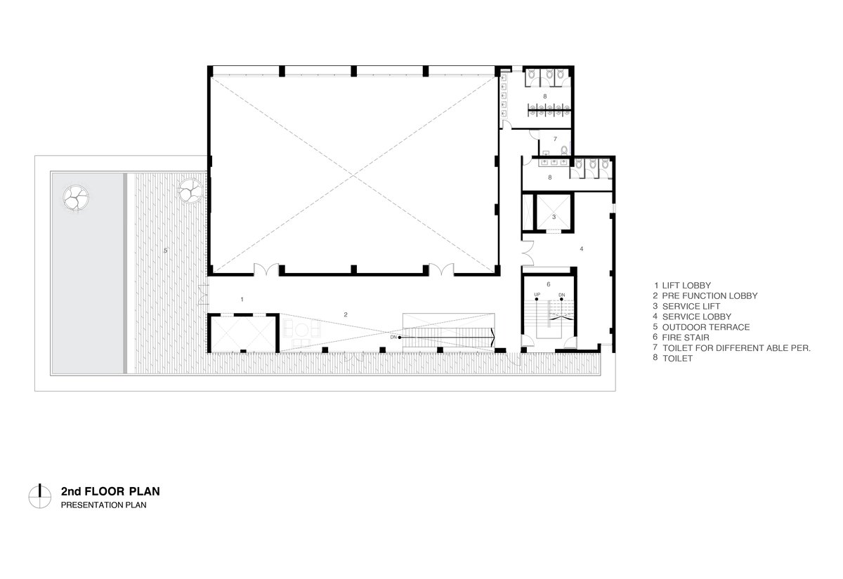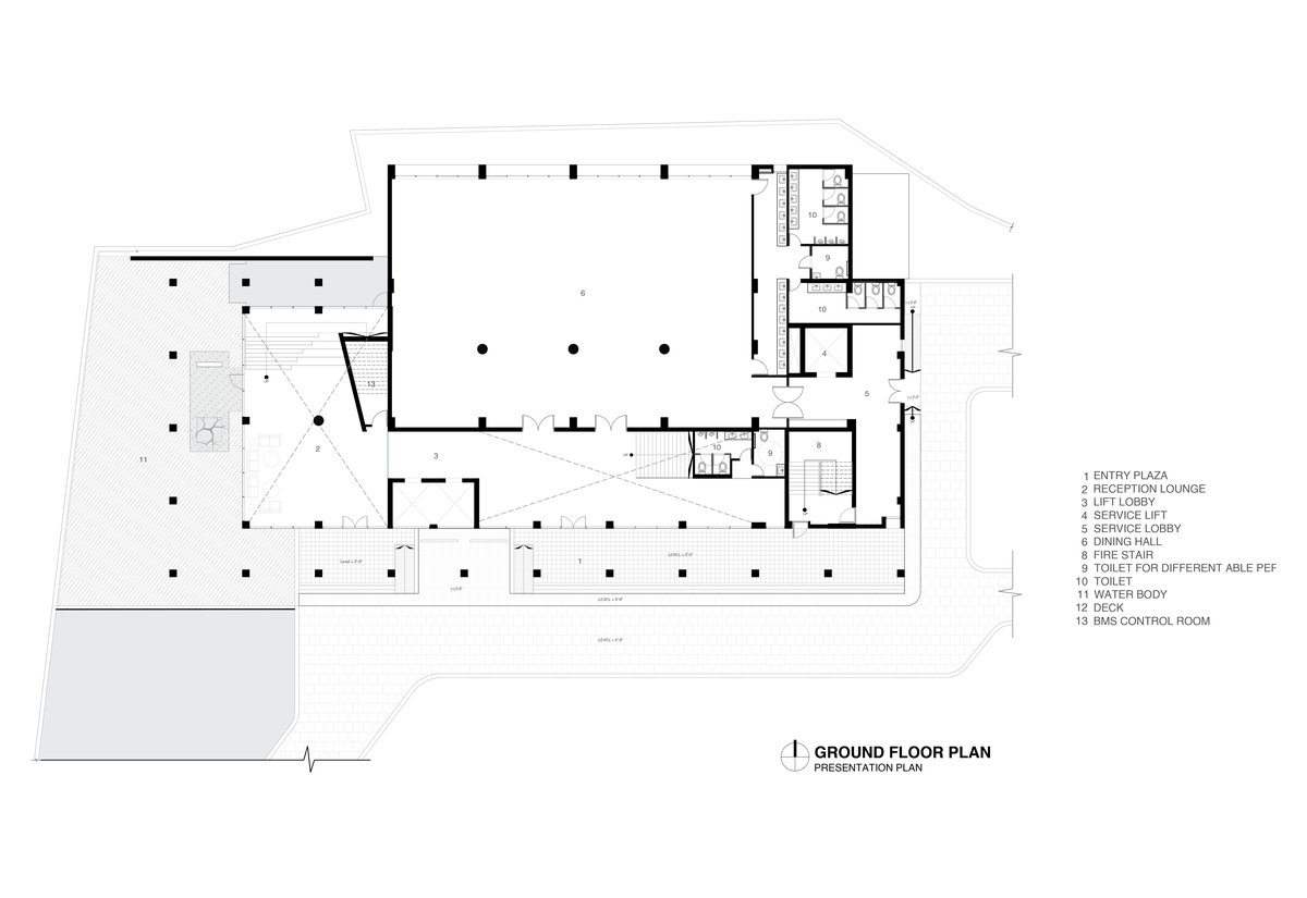 With the lake and a jungle existing within the north, there is a degree of peace and tranquility in the area. In order to reflect all the natural fauna and to allow the users to have a view from every point, the entire exterior was made to be transparent. In order to keep the transparency, the exterior has a deep double height colonnade that not only holds a large terrace on top, but allows for deep shading to the users. The terrace is green and is accessible to all, letting the users have a respite especially during long functions. Taking advantage of an existing ditch, the lobby also has a water feature that allows another interaction with the water. The main color scheme is white and gray, with the portions in white highlighting the structure and gray tones that blend in with the background giving a nice visual contrast.