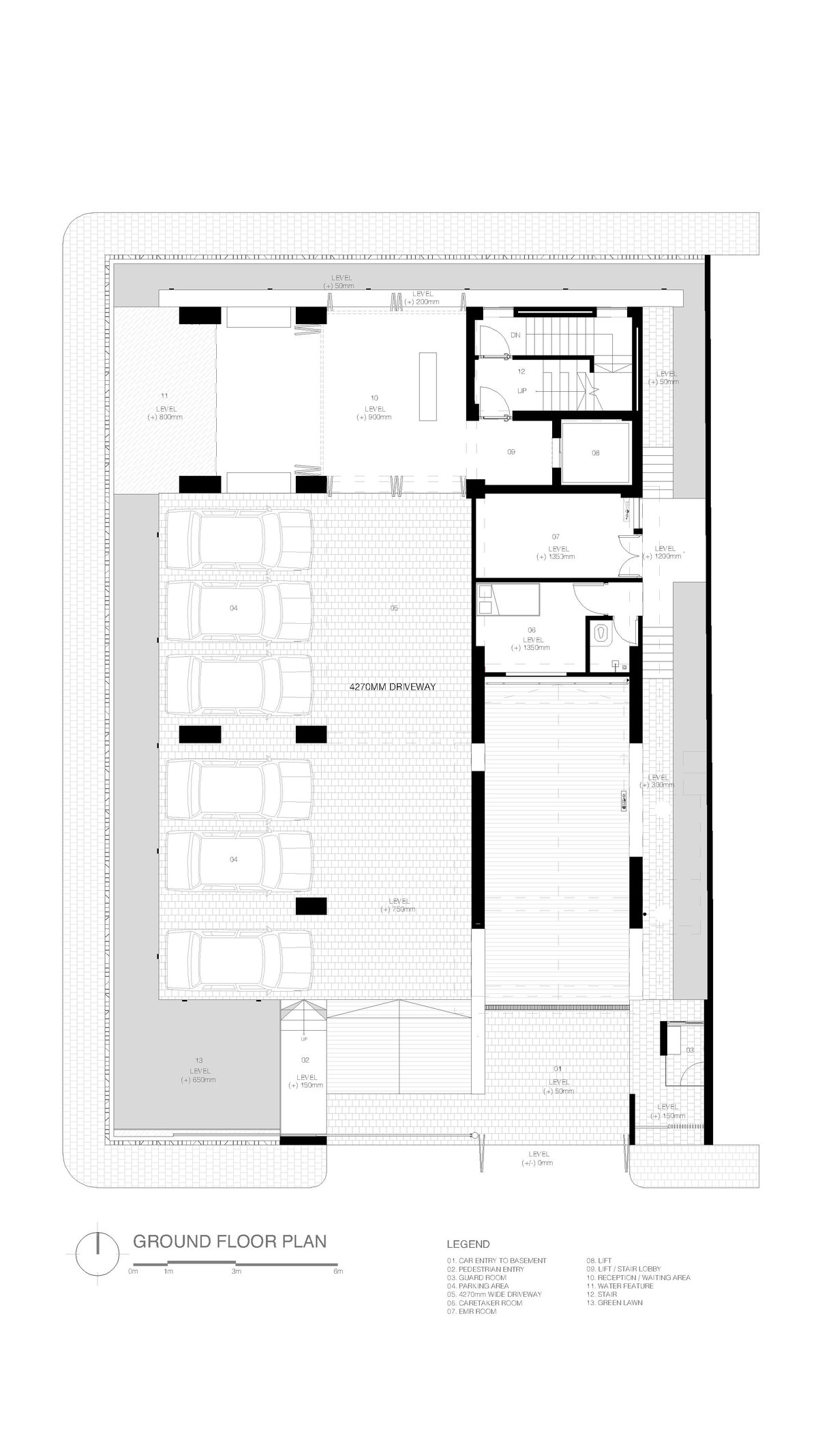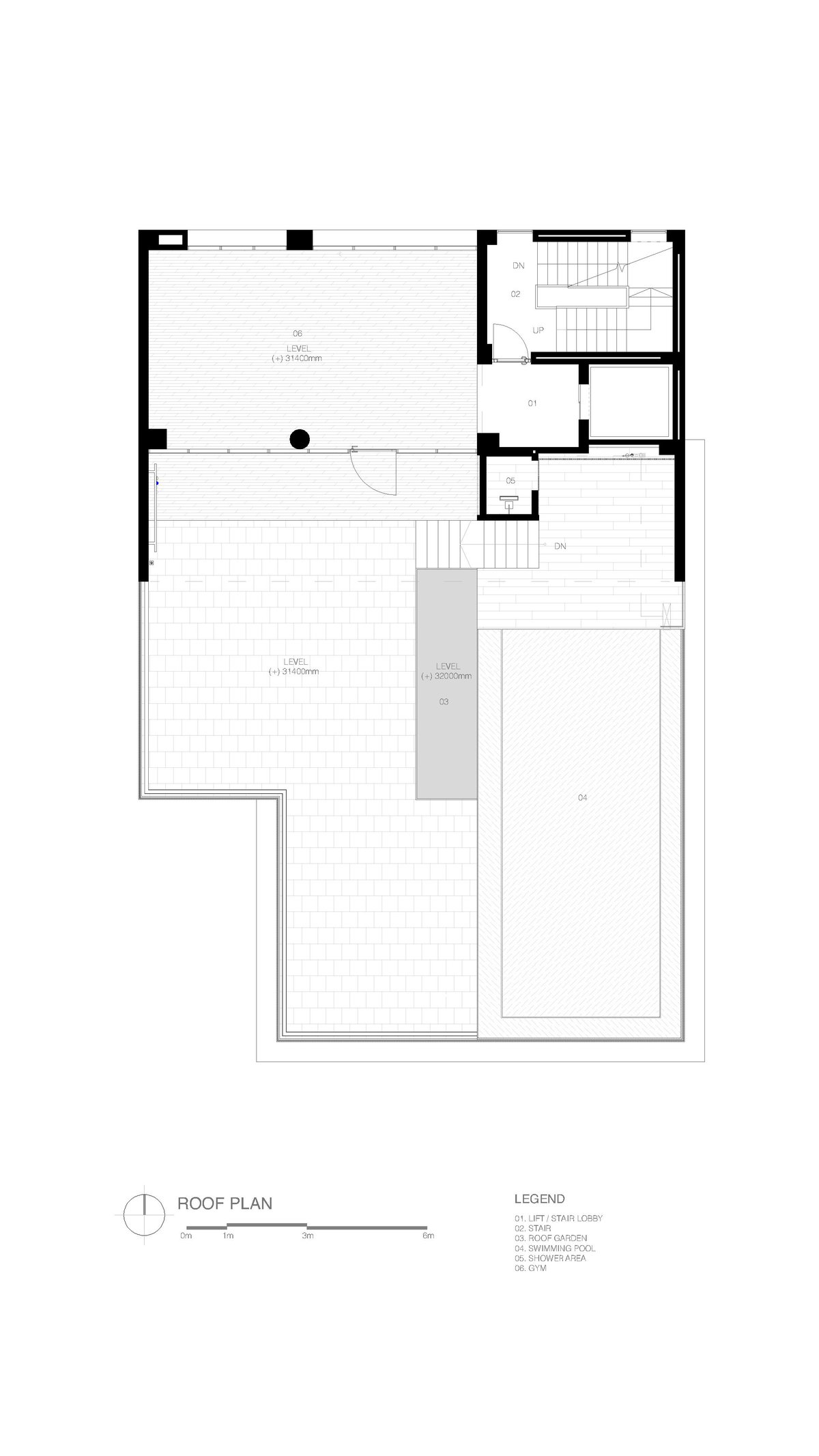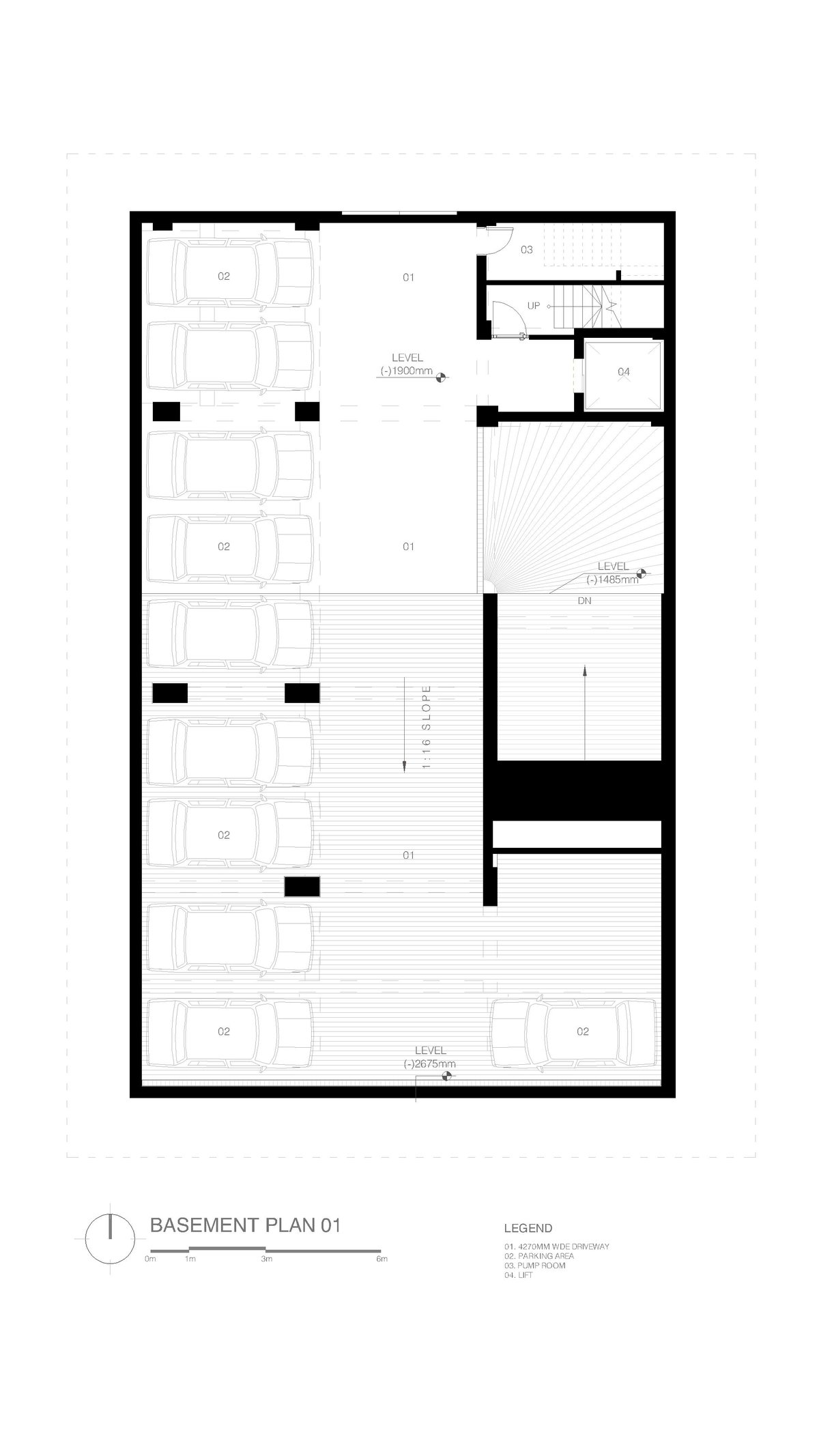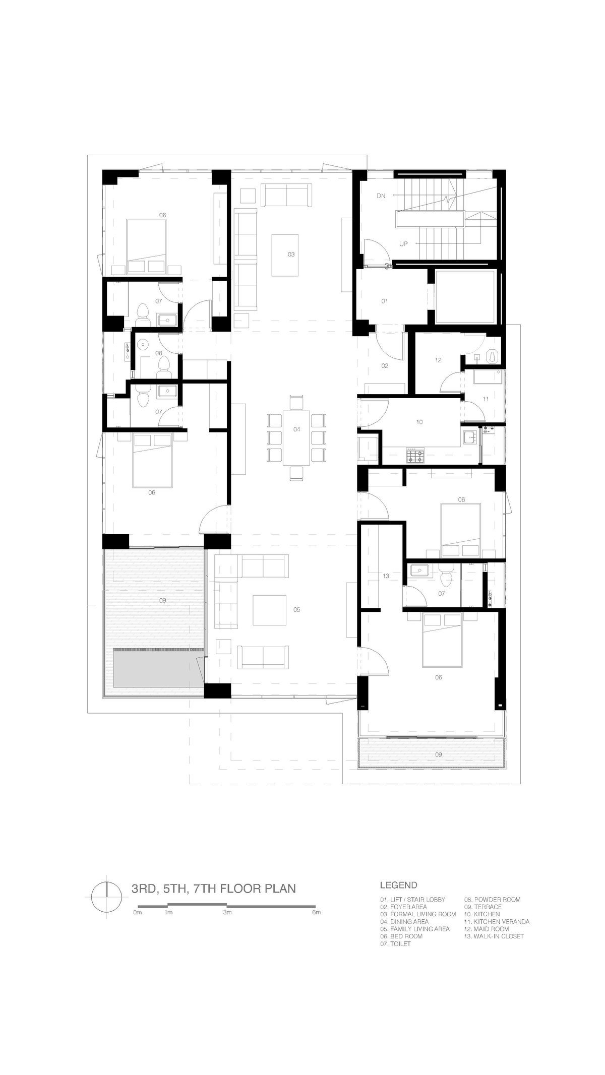 The main feature for the design of this apartment building is the usage of double height spaces to make a variety for the residents inhabiting it. Located in Bashundhara, the site of the design is situated within a corner that is enclosed by three roads, hence why there’s an option to have different views for the people living within the apartment. The main road is chosen as the entry road, and since each floor only has one unit, this means every unit has the same viewing experience.
