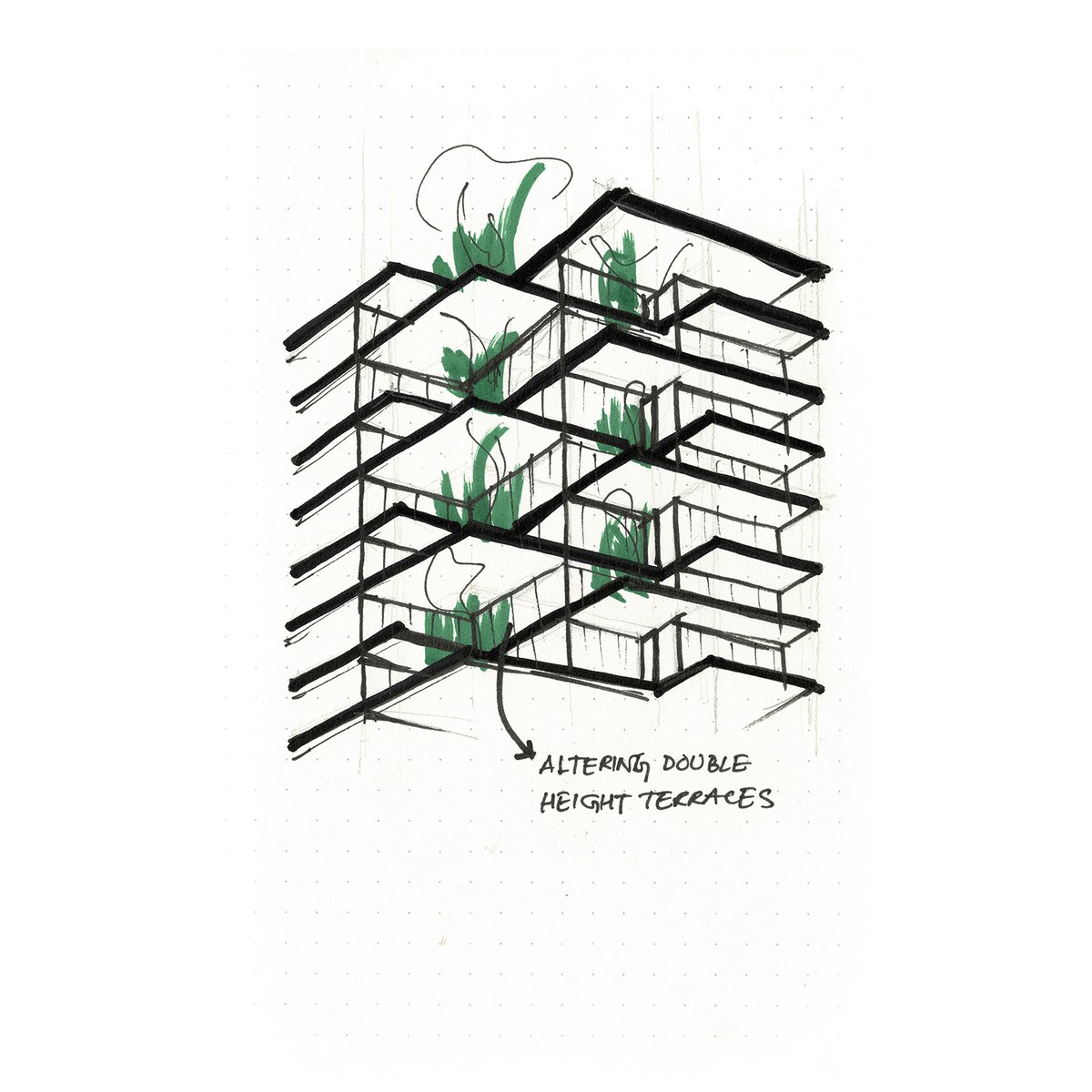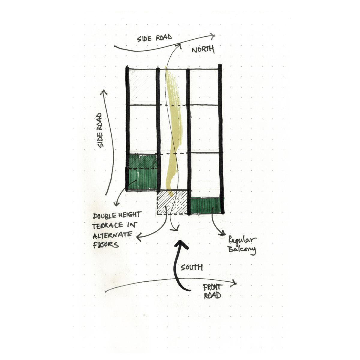 The center of the building is considered the common space for the entire building, thus maximizing the usage of all three open sides of the site. This is also achieved by using a modular construction. The rooftop also contains a common space to foster interactions between the residents. In order to have an environmentally conscious design, daylight usage is maximized through using double glazed glass, while each double height space is used to create a green space so that the carbon footprint of the design is reduced.