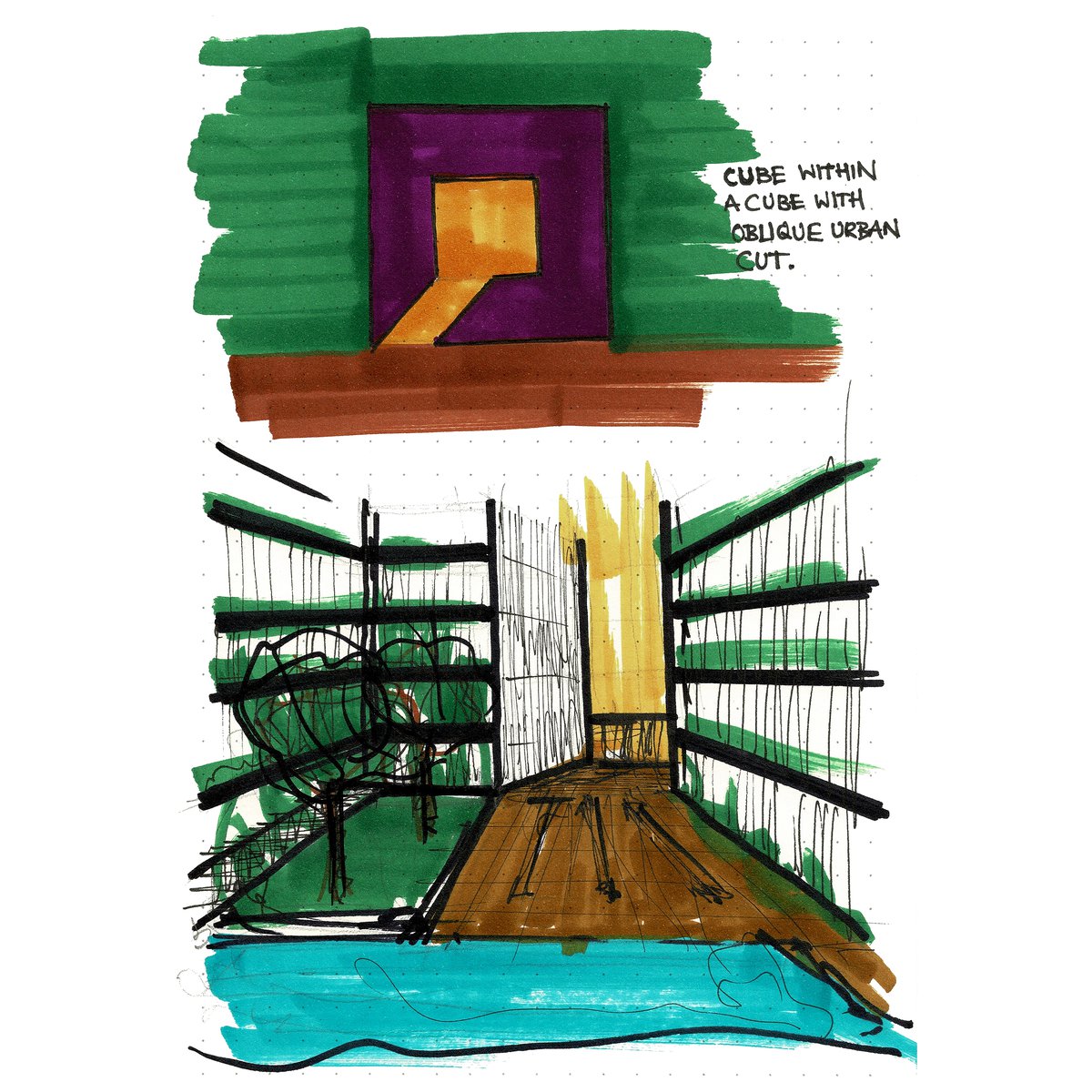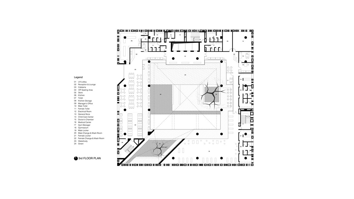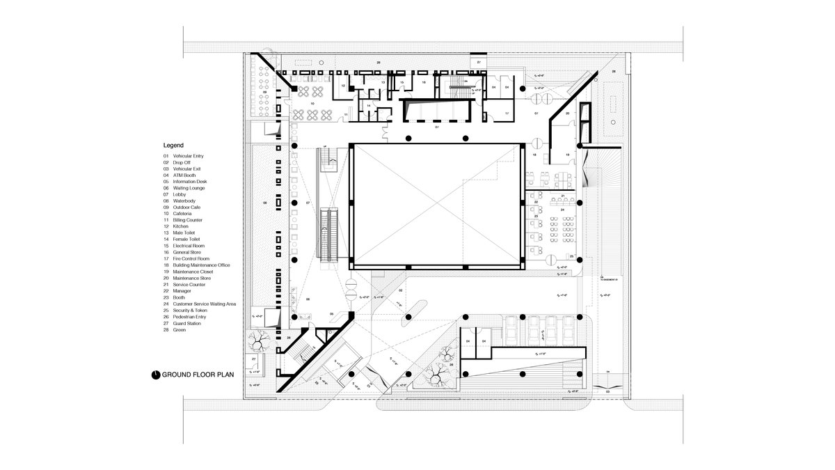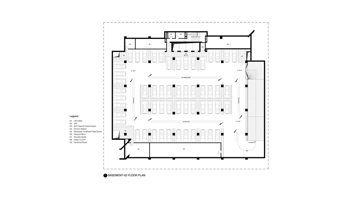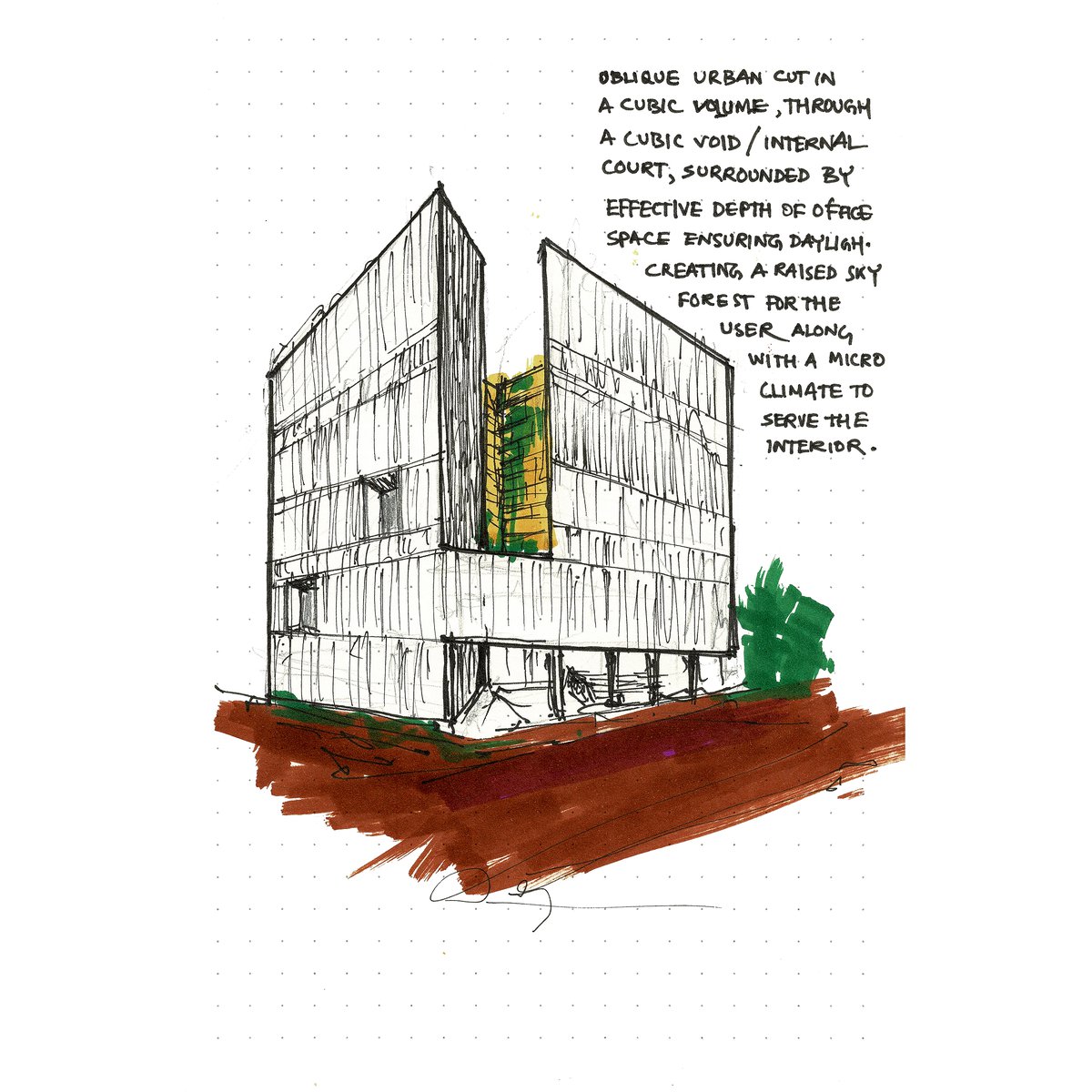 A courtyard with a water feature and plenty of greenery not only provides a relaxing environment but also has an opening that was cut out at a 45° angle that allows a loft window into the outside world. The courtyard is surrounded by common facilities shared by every user in the building like the library, gym and cafe among other facilities. Keeping with the environmentally conscious design, the building uses mainly concrete, glass and aluminum. With concrete being a porous material, it creates a breathable environment within the office, especially since the plaster paint has not been used on the walls. In formal expression the mass was a sculpted cube of 172’. As the site was a commercial site, so we took the benefit of podium and a open elevated courtyard within a mass having same outline.