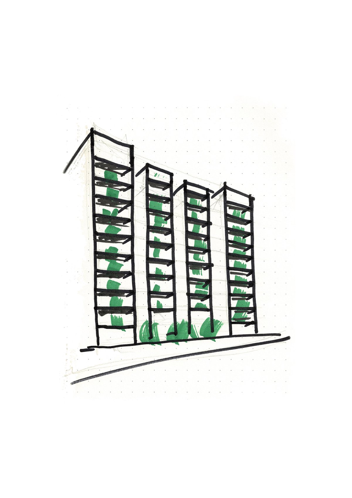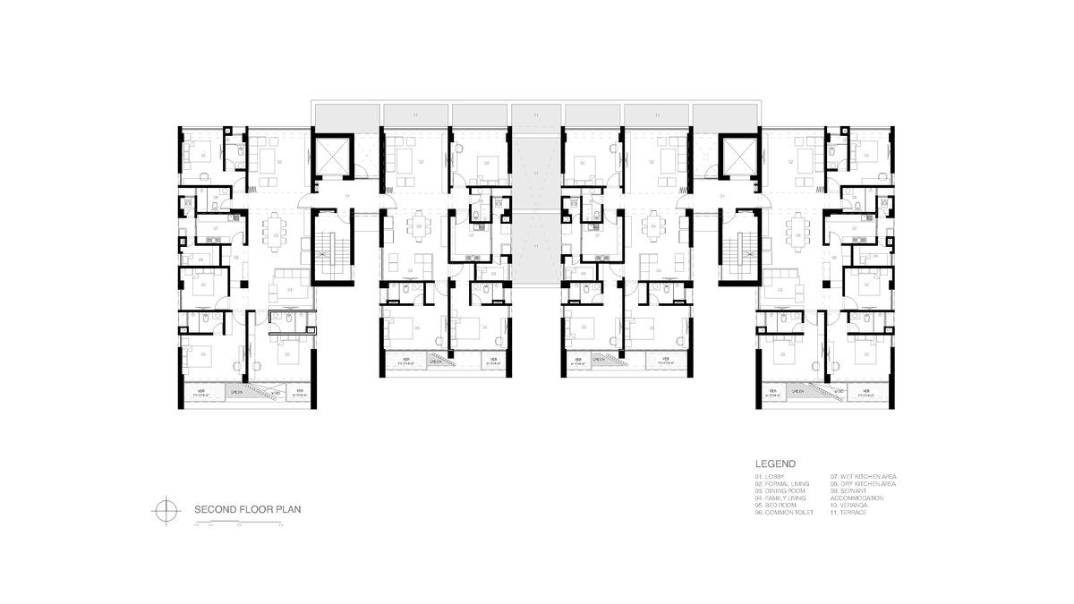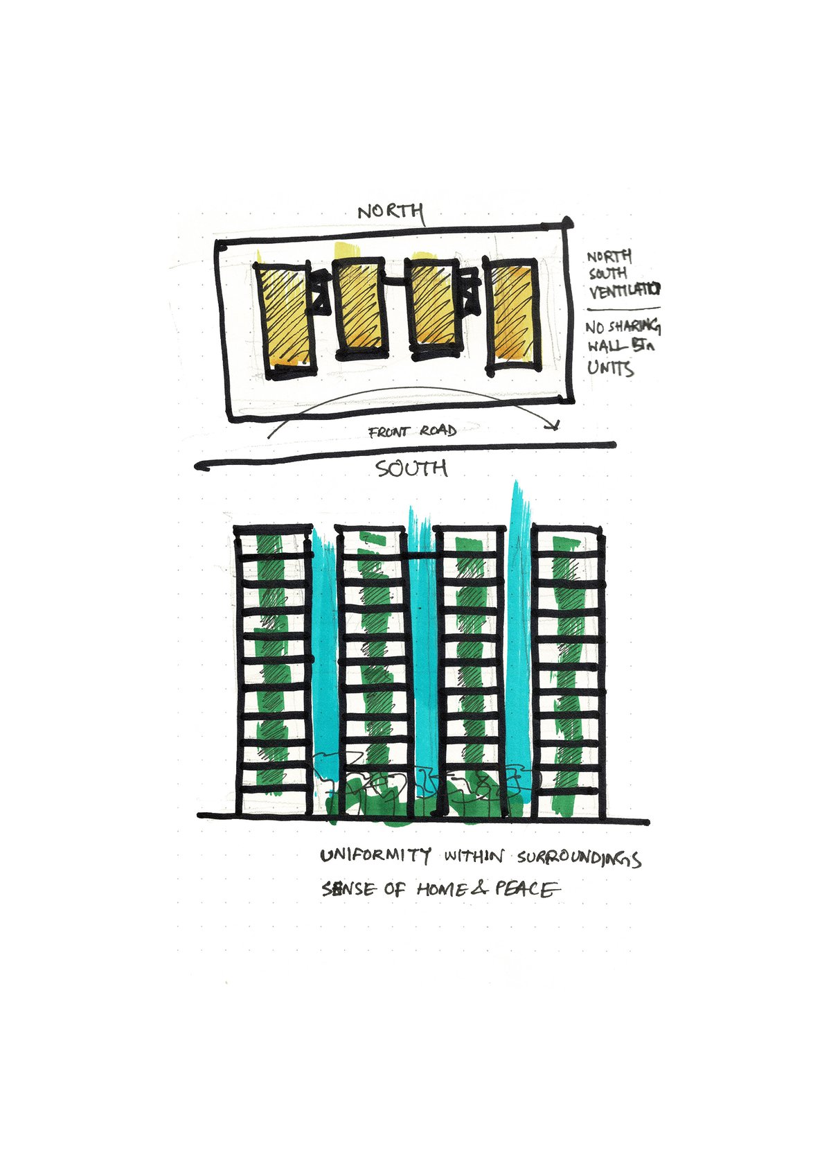 While making the apartment design, one of the things that was kept in mind was creating the most efficient and simple layout possible, so that the inhabitants could customize to their wishes. While trying to maintain the privacy for all the residents, the roof however was built to be enjoyed by the community within the apartment space. With a semi-open roof, that has both enclosed and open spaces in order to create interactions according to the situation. These spaces are also where the majority of the green is kept too, so it provides a way for the community residing within it to have a pocket haven as well. There are flowing spaces in between the lobby to create a transparent environment.