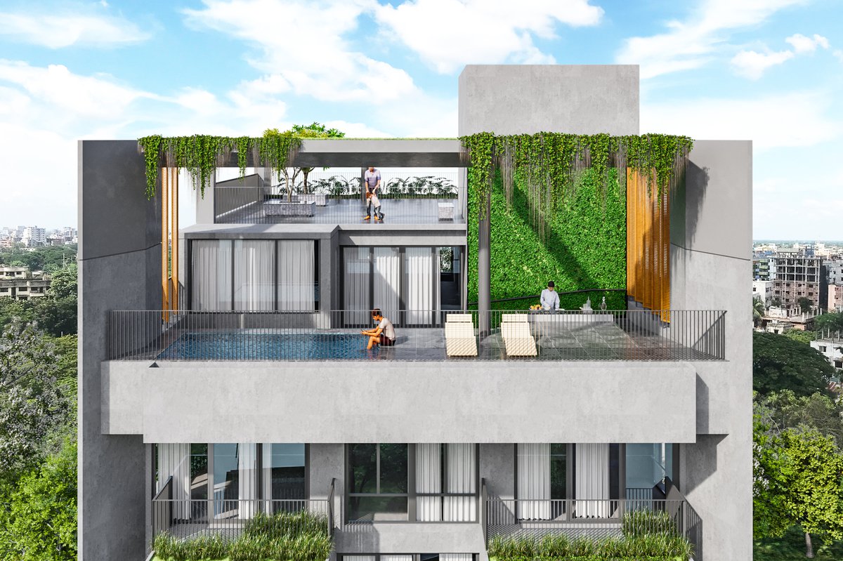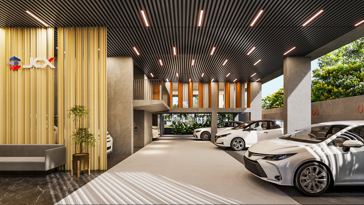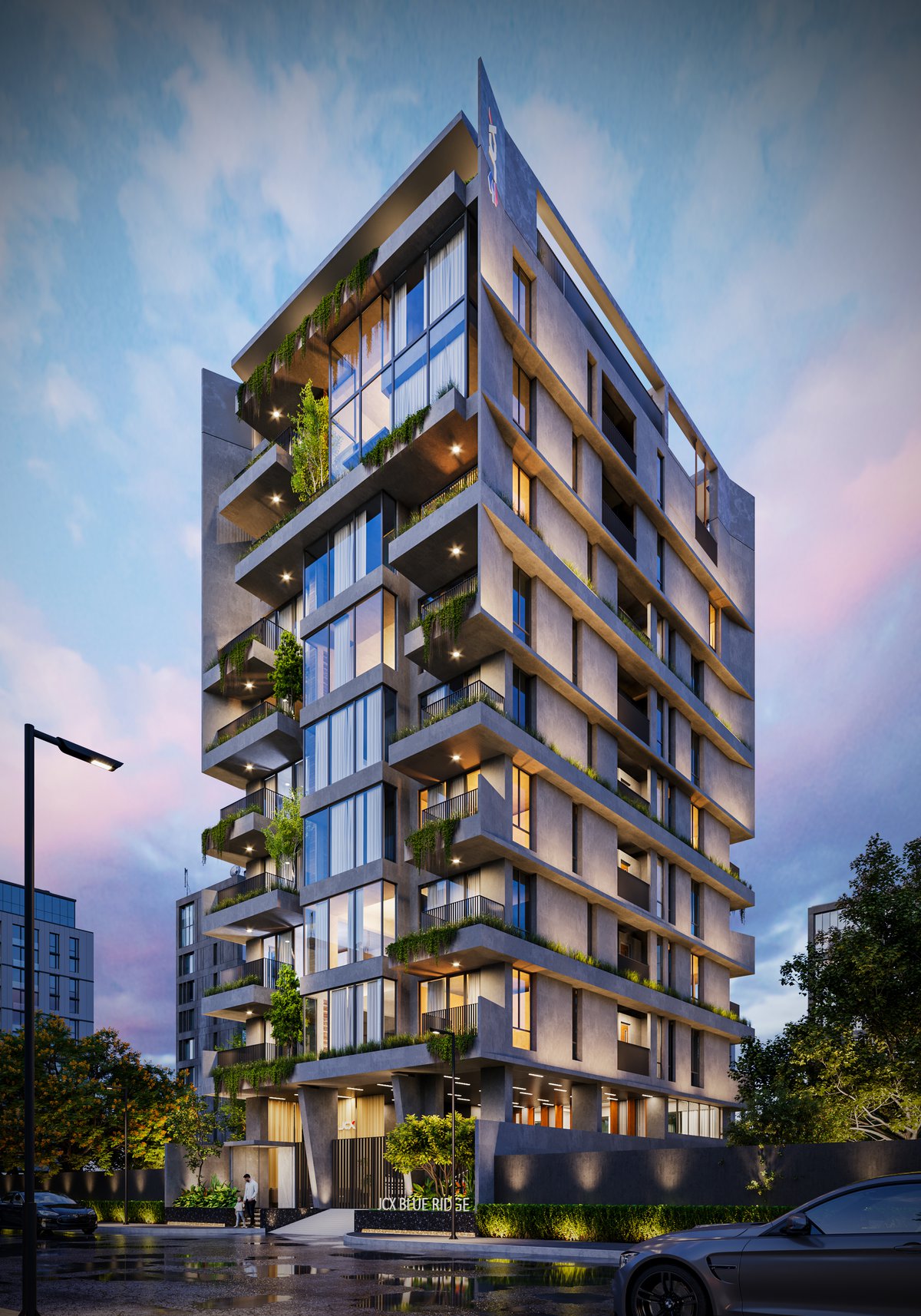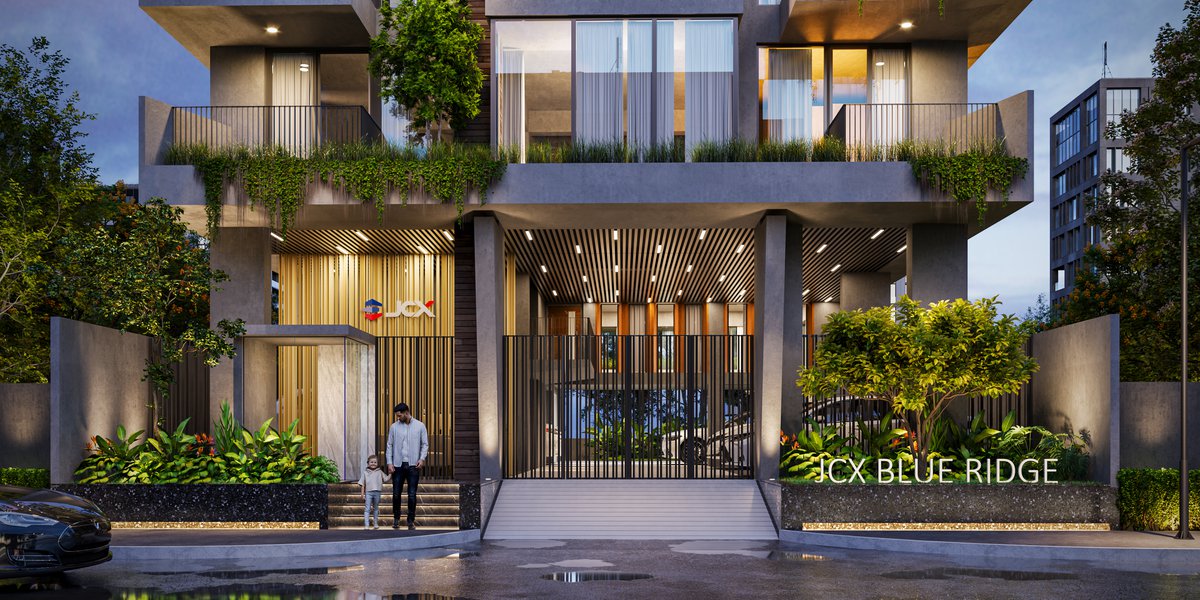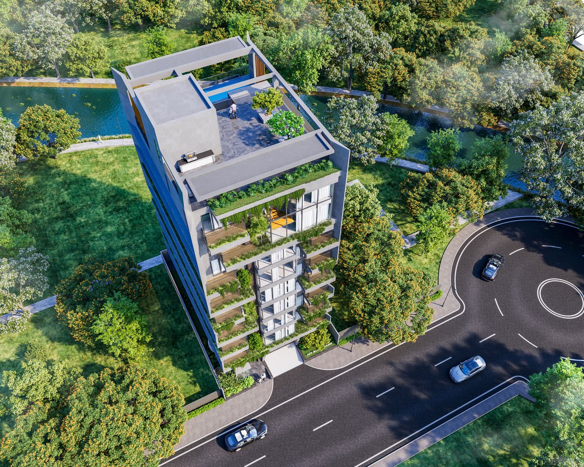 JCX Blue Ridge is a refined nine-storied residential development set in the serene landscape of Jolshiri, thoughtfully positioned near a lakeshore with picturesque views extending into a lush park. Designed to offer an elevated living experience, the building accommodates six exclusive single-family dwelling units, ensuring privacy and a sense of exclusivity. Crowned by a luxurious duplex on the top floor, the project features a shallow pool overlooking the lake, creating a tranquil retreat that seamlessly blends architecture with nature. The design emphasizes openness, natural light, and panoramic vistas, fostering a calm yet contemporary lifestyle. With its harmonious integration of scenic surroundings and modern spatial planning, JCX Blue Ridge redefines urban living through comfort, elegance, and a strong connection to its natural context.
