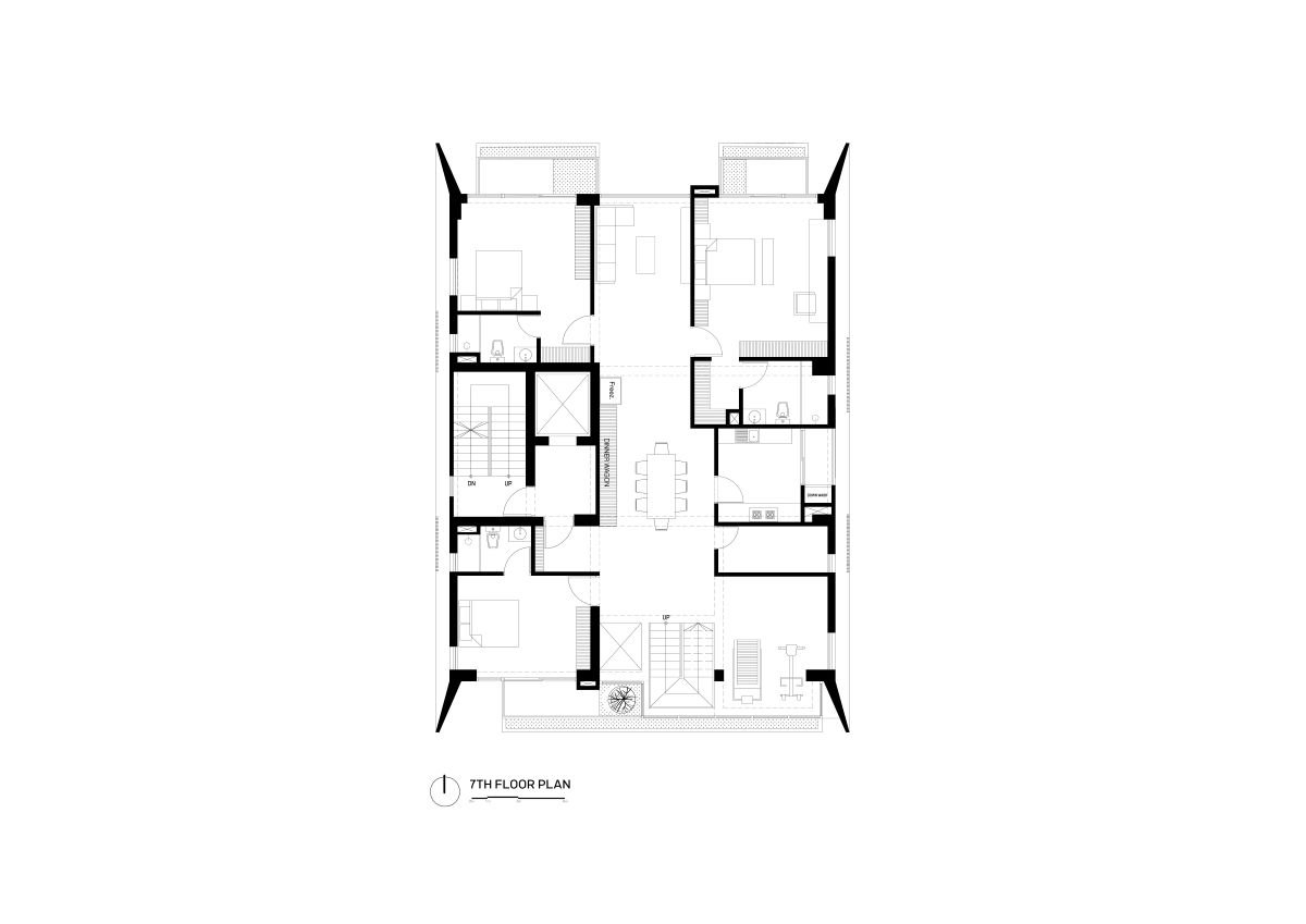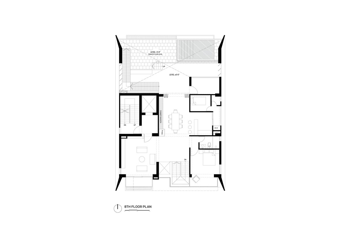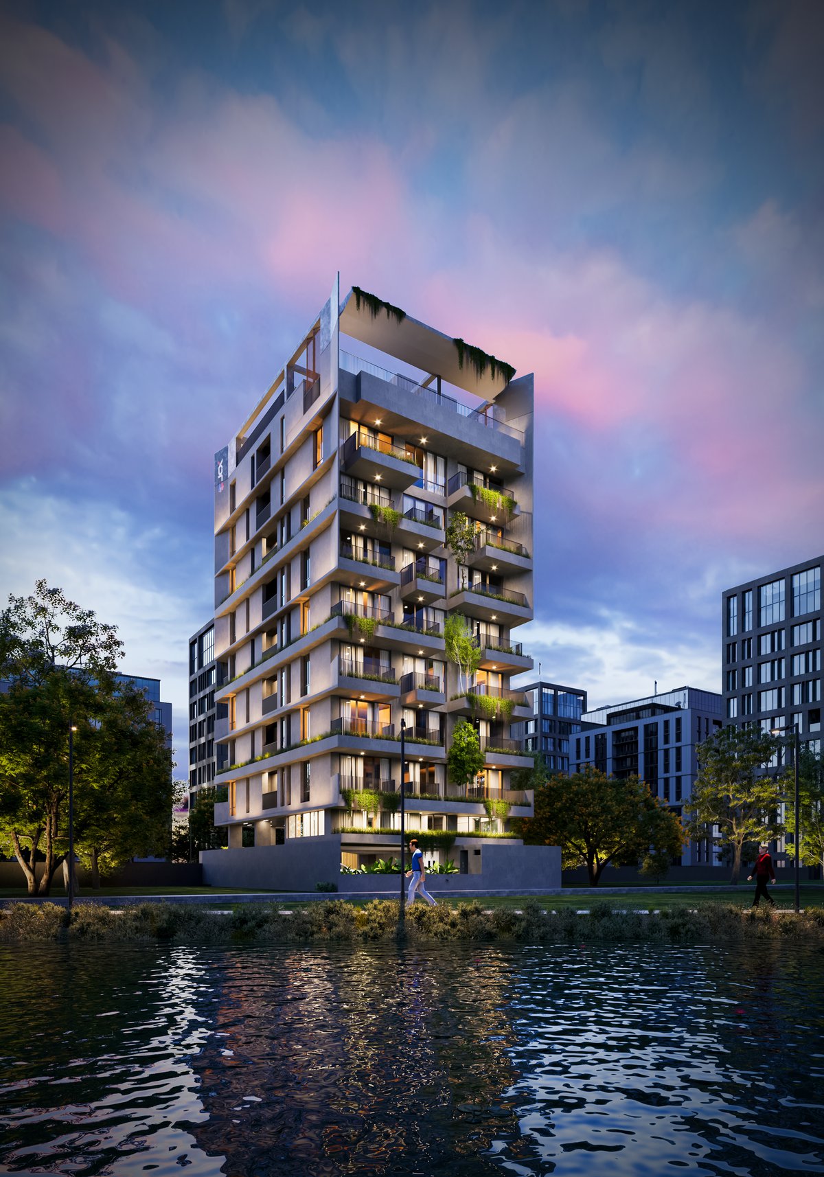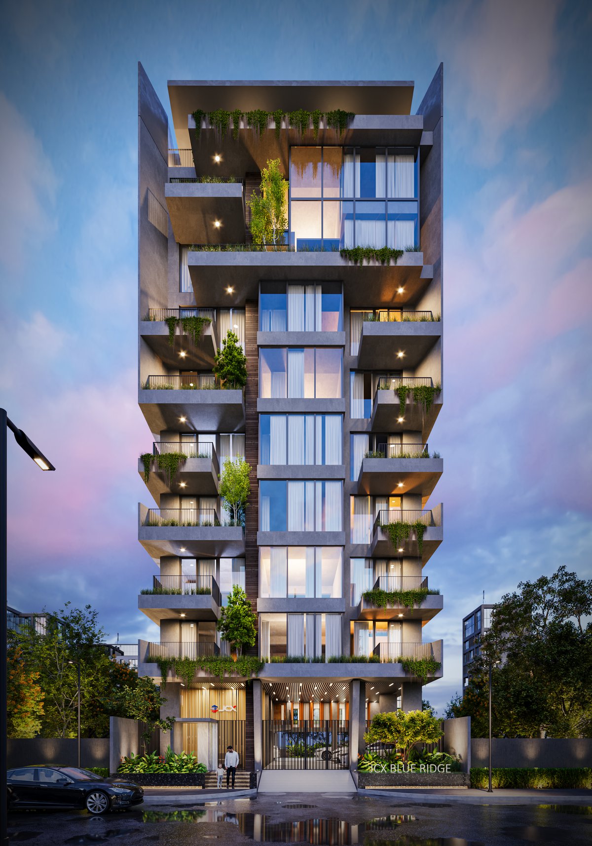 JCX Blue Ridge is a refined nine-storied residential development set in the serene landscape of Jolshiri, thoughtfully positioned near a lakeshore with picturesque views extending into a lush park. Designed to offer an elevated living experience, the building accommodates six exclusive single-family dwelling units, ensuring privacy and a sense of exclusivity. Crowned by a luxurious duplex on the top floor, the project features a shallow pool overlooking the lake, creating a tranquil retreat that seamlessly blends architecture with nature. The design emphasizes openness, natural light, and panoramic vistas, fostering a calm yet contemporary lifestyle. With its harmonious integration of scenic surroundings and modern spatial planning, JCX Blue Ridge redefines urban living through comfort, elegance, and a strong connection to its natural context.
