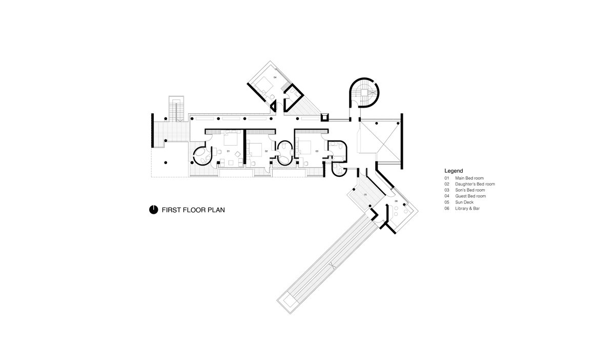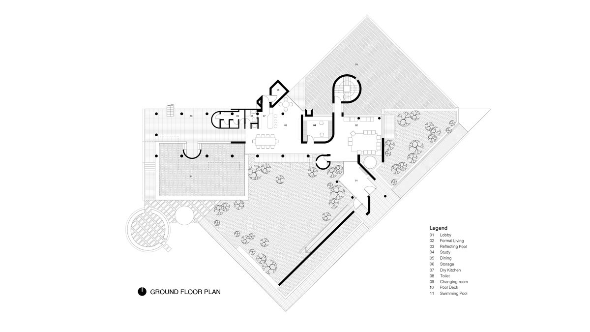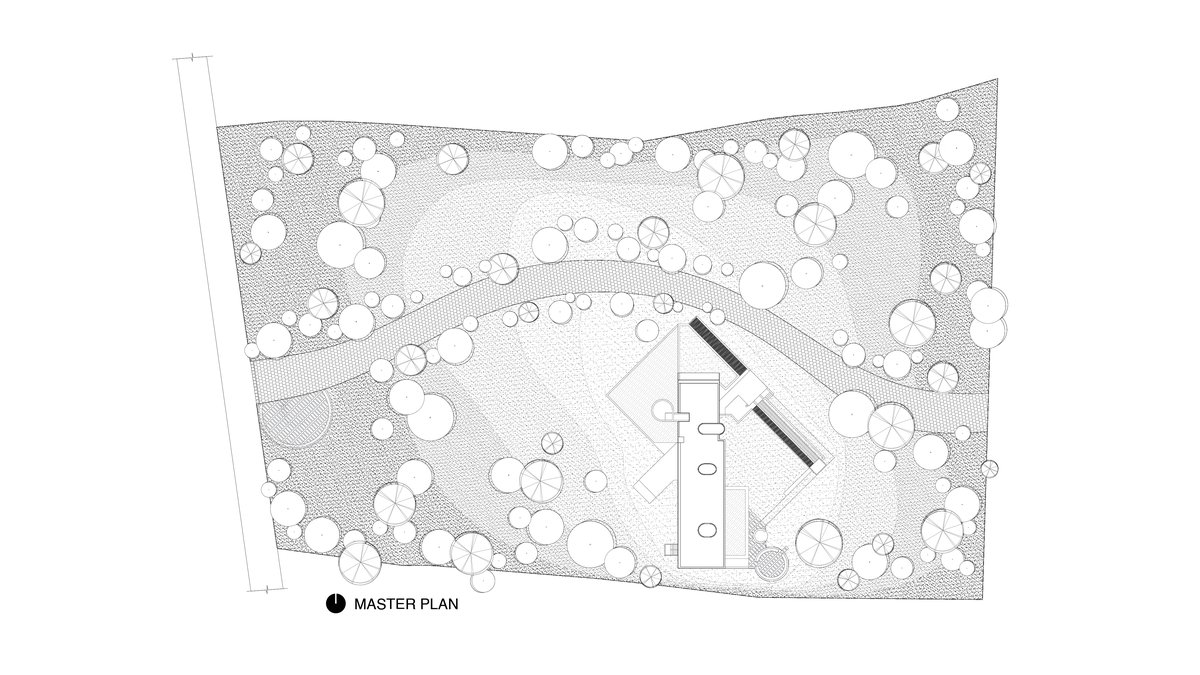 With the limited amount of space to work with, a compromise was achieved using pragmatic geometric guidance, taking a modern approach to the design. The form mainly respects the existing spaces created by the forests, so the key in making interesting spaces is by utilizing height variations. The two ends of the residence have a double height space to ensure adequate sunlight to spread through, with one of the double height spaces attached to a pool creating a peaceful environment.