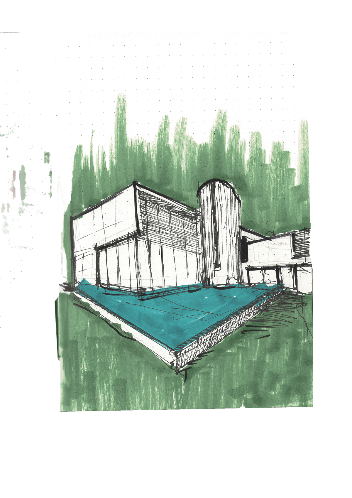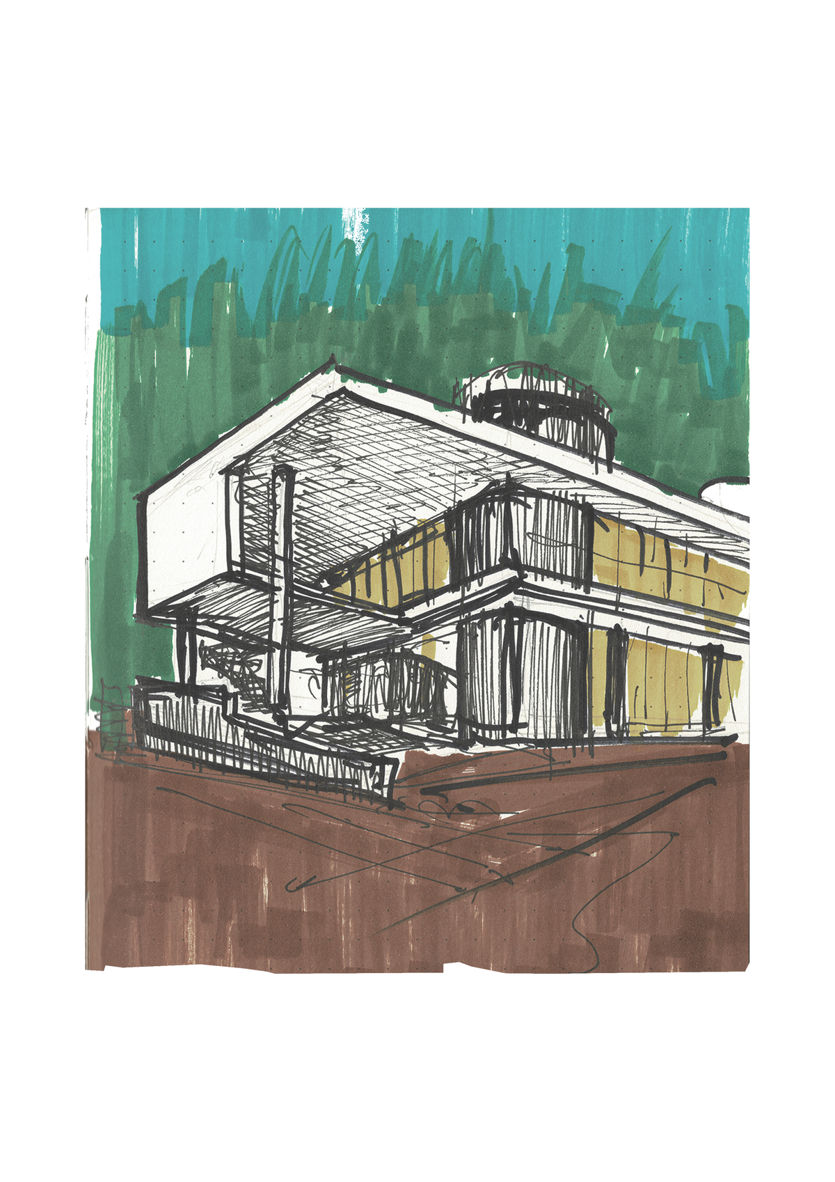 Due to all the trees surrounding the site, it is hard for sunlight to reach through the entire area properly, so a key factor in design was to maximize the amount of natural light that could be utilized. Contrasting the deep green shades and to reflect more light in the building, the color white was predominantly used.