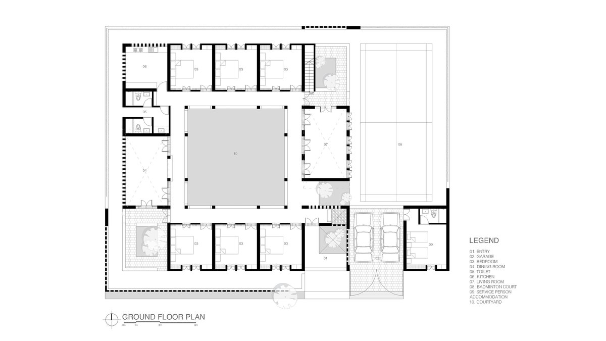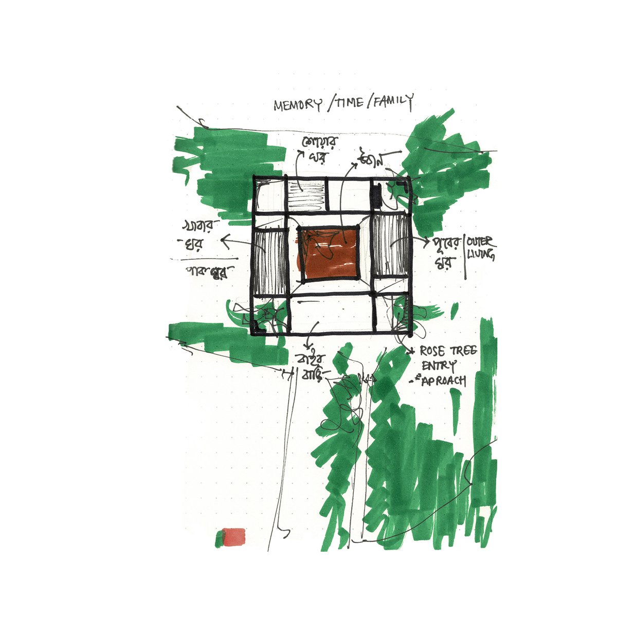 In the outskirts of a quaint and serene village within Tangail, close to a canal and nestled within a mahogany forest, lays a perfect location for family gatherings. Being an intimate area that has stayed within the client’s family for a long time, it is now the ideal spot as a haven away from the hustle bustle of the city and for the family to reconnect. The area previously had a very typical residential setting that most rural areas in Bangladesh do, with a courtyard present where most of the family’s activities occur during the day. Hence, the new design for the residence respects the previous layout and zoning in order to keep the memory of the spaces alive.